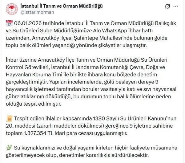 İstanbul İl Tarım ve Orman Müdürlüğü’nden yapılan açıklamada, “Balıkçılık ve Su Ürünleri Şube Müdürlüğümüze Alo WhatsApp ihbar hattı üzerinden Arnavutköy ilçesi Şirintepe Mahallesi’nde bulunan gölde toplu balık ölümleri yaşandığı yönünde şikâyetler ulaşmıştır. İhbar üzerine Arnavutköy İlçe Tarım ve Orman Müdürlüğü Su Ürünleri Kontrol Görevlileri ile İstanbul İl Jandarma Komutanlığı Çevre, Doğa ve Hayvanları Koruma Timi tarafından bölgede denetim gerçekleştirilmiştir. Yapılan incelemelerde, gölü besleyen dereye 9 hayvancılık işletmesi tarafından borular aracılığıyla katı ve sıvı hayvansal gübre atıklarının döküldüğü ve bu durumun toplu balık ölümlerine neden olduğu tespit edilmiştir. 1380 sayılı Su Ürünleri Kanunu’nun 20’nci maddesi gereğince 9 işletme sahibine toplam 1.327.354 TL idari para cezası uygulanmıştır. Su kaynaklarını ve doğal yaşamı kirleten faaliyetlere müsamaha gösterilmeyecek, denetimler kararlılıkla sürdürülecektir." denildi.