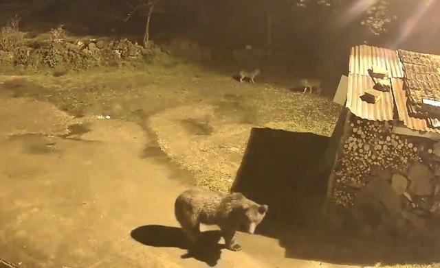 Artvin’de ilkbaharın gelmesiyle birlikte kış uykusundan uyanan ayılar, yiyecek bulmakta zorlanınca yerleşim yerlerine inmeye başladı. Farklı noktalarda görüntülenen ayılar, hem köylerde hem de kara yollarında kameralara yansıdı. Arhavi ilçesine bağlı Dik Yamaç köyü Akıncılar mevkiinde Yılmaz Kuru’ya ait evin güvenlik kamerasına yansıyan görüntülerde bir ayının köy içinde yiyecek arayıp etrafta dolaştığı, ardından bölgeden uzaklaştığı görüldü. Görüntülerde ayının peşine takılan iki tilki ise dikkat çekti.