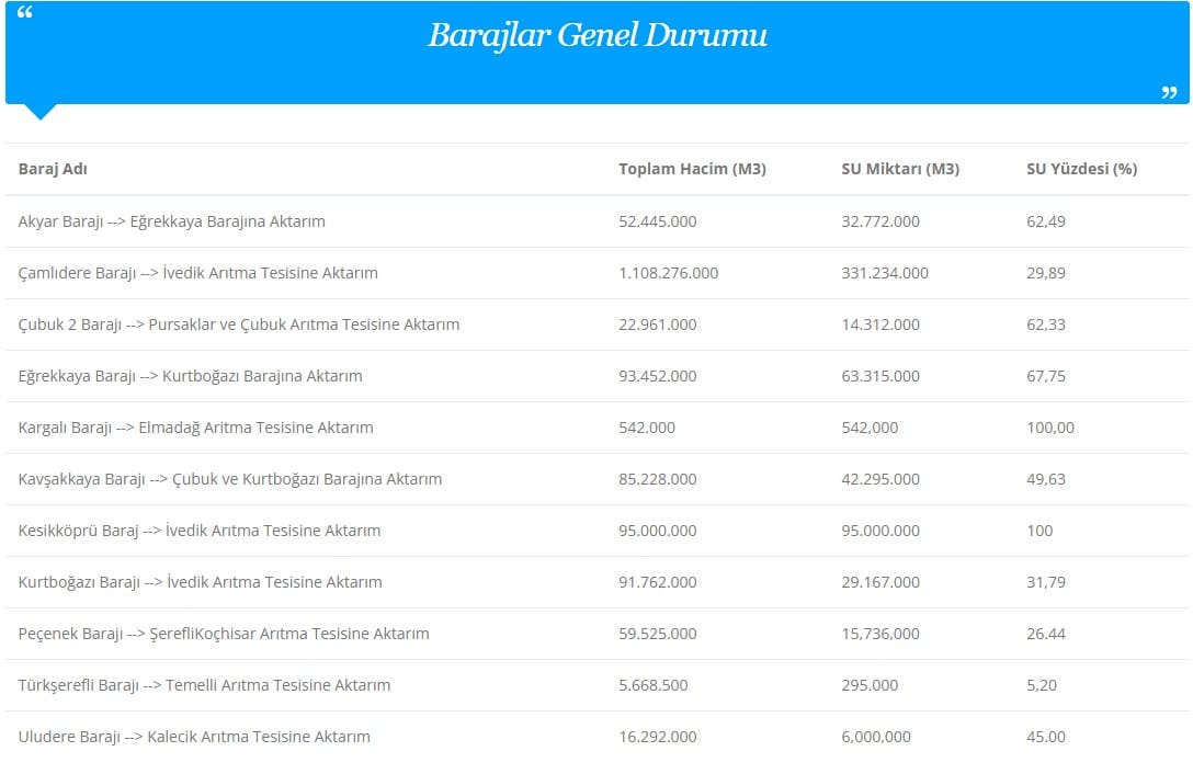 4 NİSAN 2026 ANKARA BARAJLARI DOLULUK ORANLARIKesikköprü: %100Kargalı: %100Akyar: %62,49Eğrekkaya: %67,75Çubuk 2: %62,33Kavşakkaya: %49,63Kurtboğazı: %31,79Çamlıdere: %29,89Peçenek: %26.44Türkşerefli: %5,20Uludere:%45,00