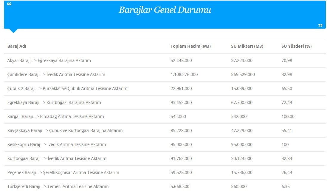 AKTİF DOLULUK NEDEN TOPLAM DOLULUKTAN DÜŞÜKTÜR?Barajdaki toplam su miktarının tamamı şehre verilemez. Barajın tabanında, fiziksel ve teknik nedenlerle borulara aktarılamayan bir miktar su kalır; buna ölü hacim denir. Geriye kalan, yani gerçekten şebekeye pompalanabilecek kısım ise aktif doluluk olarak ifade edilir. Ankara barajlarında bu fark özellikle belirgin; bugün toplam doluluk oranı 33,40 iken aktif doluluk yüzde 25,64 seviyesinde. Su yöneticilerinin asıl baktığı rakam aktif doluluktur.