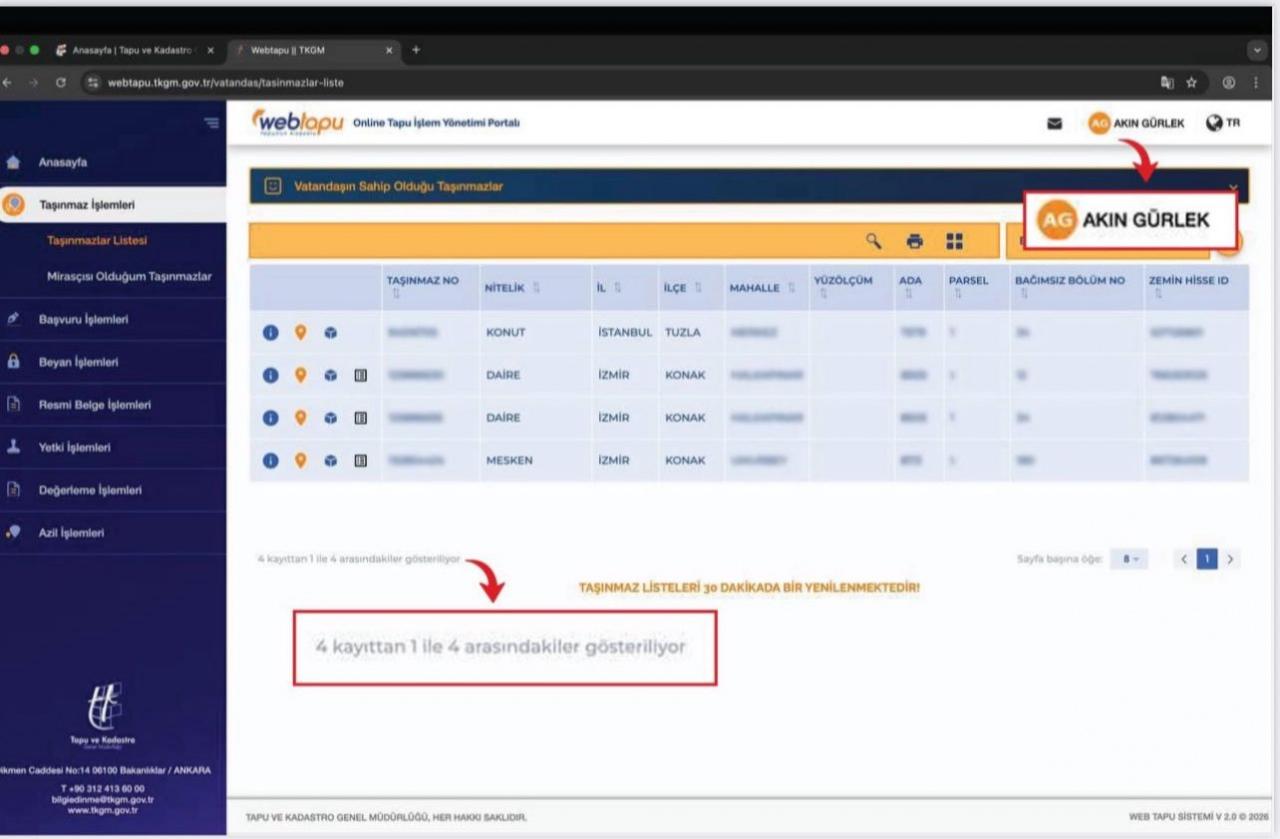 Sonrasında Akın Gürlek'in WebTapu sistemi üzerindeki kaydı paylaşıldı. Görüntülere göre 3 taşınmaz İzmir'de, 1 taşınmaz İstanbul'daydı.