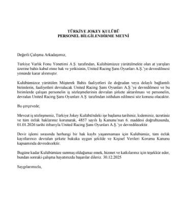 Türkiye Varlık Fonu Yönetimi A.Ş., yurt içinde gerçekleştirilen at yarışlarına dayalı müşterek bahislerin organizasyon yetkisini United Racing Şans Oyunları A.Ş.’ye devretme kararı aldı. Gelişme, Türkiye Jokey Kulübü’nün (TJK) çalışanlarına gönderdiği kurum içi bilgilendirme mesajıyla resmiyet kazandı.