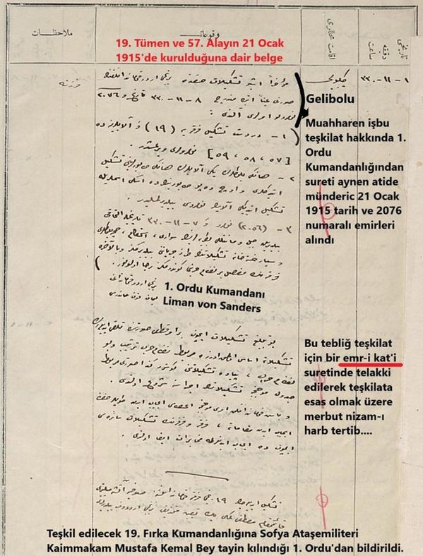 "TÜMENİN NUMARASI DA AYNI GÜN VERİLİYOR" Bu sırada Sofya'da askeri ateşe olarak görev yapan Mustafa Kemal Bey'in ısrarla faal bir görev istediğini belirten Dr. Sabah, "Kendisi yeniden kurulması düşünülen bu tümenin komutanlığına atanacaktır. Mustafa Kemal Bey'in atanma yazısına baktığımızda '19' numarasının geçmediğini sadece yeniden teşkili düşünülen tümen komutanlığına atandığı ibaresinin geçtiğini görmekteyiz. Çünkü 20 Ocak 1915 tarihinde Mustafa Kemal Bey, tümen komutanlığına atandığında tümenin numarası da aynı gün veriliyor. Bunun üzerine 1’inci Ordu Komutanı Mareşal Liman Von Sanders ertesi gün 3'üncü Kolordu'ya emir veriyor. 21 Ocak 1915 tarihinde 3'üncü Kolordu ceridelerine baktığımızda Liman Paşa'dan gelen bu emrin 'kesin' bir emir kabul edildiğini ve tümenin teşkilat çalışmalarına başlandığını, yani resmen kurulmuş olduğunu görmekteyiz" dedi.