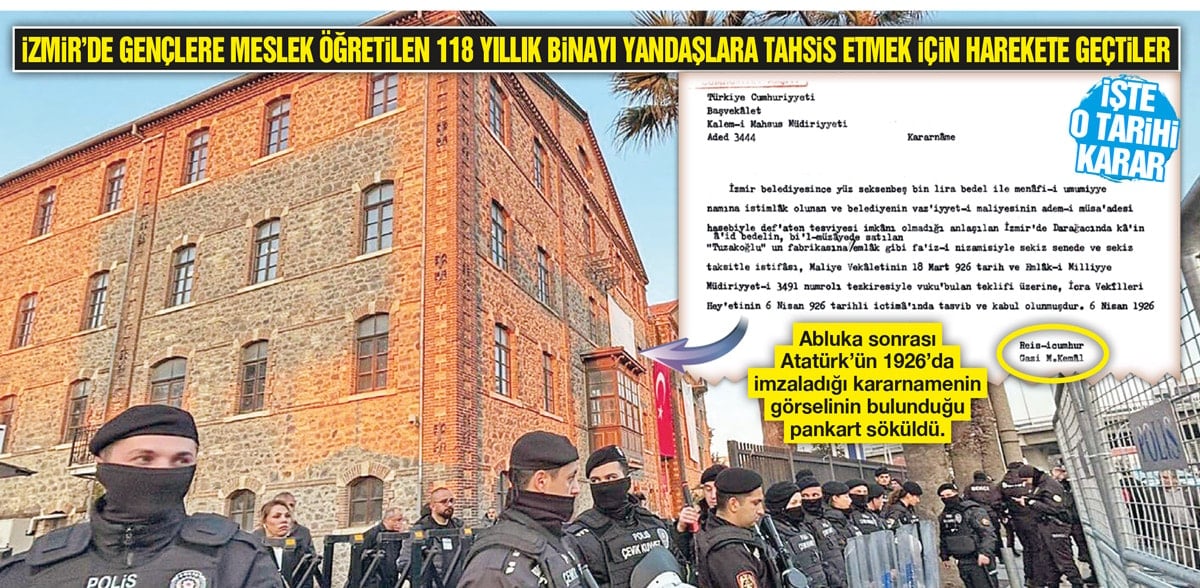 Verilen süre dün doldu. Bina, polis zoruyla Vakıflar Genel Müdürlüğü’nün kontrolüne geçti. Dün saat 04.45’te Konak Halkapınar Şehitler Caddesi üzerindeki binaya yüzlerce polis sevk edildi. Polisler, Meslek Fabrikası’nın etrafını kuşattı, bariyerler koydu ve abluka altına aldı. Belediye çalışanları binada uzun süre mahsur kaldı.
