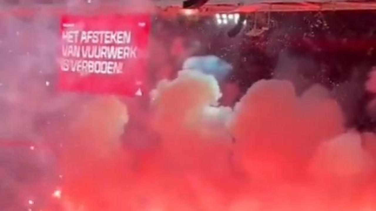 Ajax taraftarı 'Hooligans' taraftar grubunun tanınan ismi Tum'u maç başında anmak için tribünlerde onlarca meşale yaktı ve ardından da sahaya doğru havai fişekler attı.