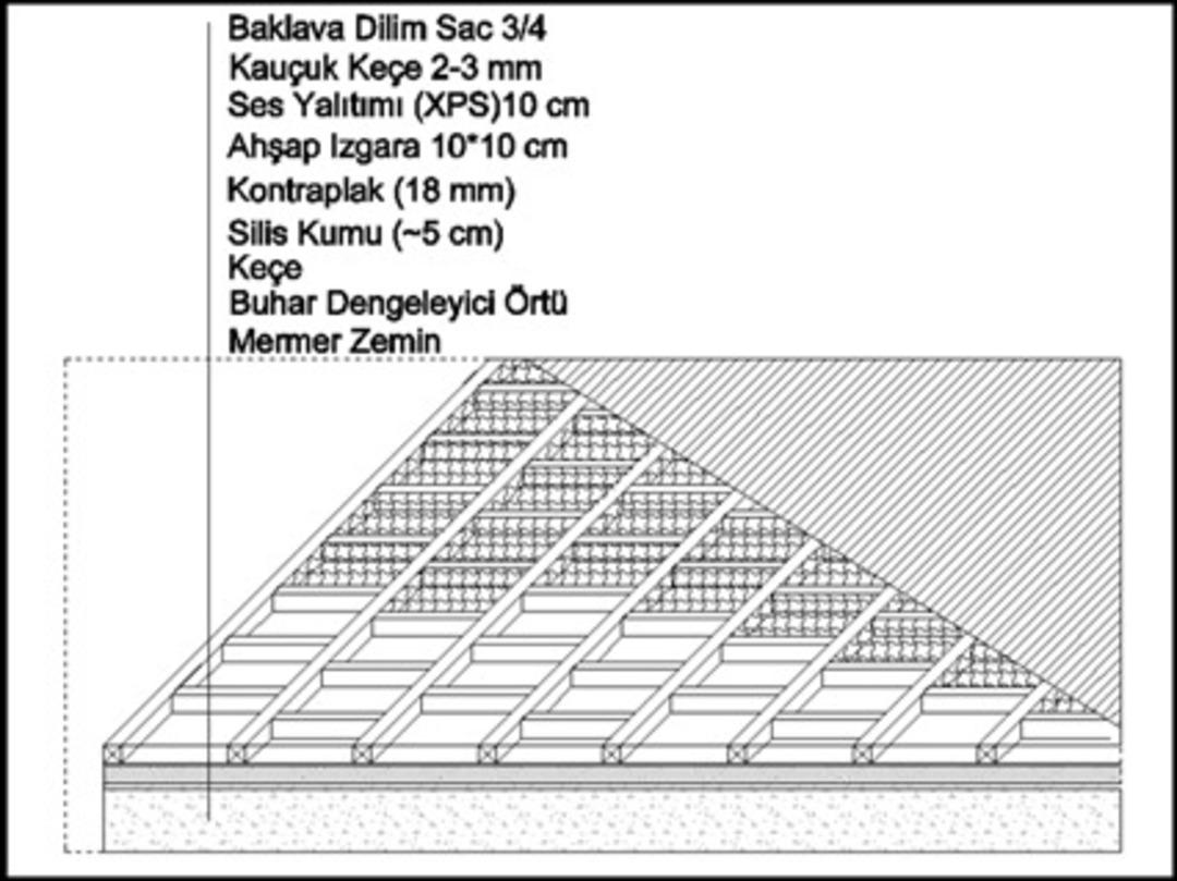 Açıklamada, "Caminin batı avlusu girişinden cami harim bölümü girişine kadar tüm zeminde statik hesaplarına uygun olarak bahçe ve iç-dış narteks bölümlerinde prekastlar ve ahşap elemanlar ile desteklenen çelik platform yapılmıştır. Bu sayede hem mermer zeminlerin korunması sağlanmış hem de alan araç girişi için uygun hale getirilmiştir. Caminin harim bölümünde öncelikli olarak mevcut mermer zeminin belgelemeleri yapılmış, mermer döşemlerin yatak harcının kontrolü sağlanmıştır. Ardından iç mekanda georadar tarama ve zemin sınıfı testi yapılmıştır. Yapılan ön çalışmaların ardından iş makinelerinin hareket edeceği tüm alanda hem yükün yayılmasını hem de mermer döşemelerin korunmasını sağlayacak çok katmanlı geçici döşeme sistemi yapılmıştır. Ayasofya'nın özgün mermer zemininin zarar görmemesi için sırasıyla buhar geçişine izin veren örtü, keçe, kum, 18 milimetre kontra, 10 x 10 santimetre ahşap karkas, karkaslar arasına xps levha, karkaslar üzerine sesi önleyen şilte, en üst katmana da baklava sac uygulanarak zeminin tamamen korunması sağlanmıştır. Çalışmalar sırasında iş makinelerinin egzoz dumanının yayılmaması için duman emici makineler kullanılmaktadır" ifadelerine yer verildi.