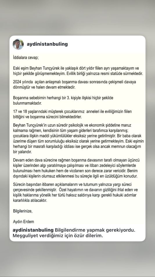 Erdem açıklamasında şu ifadelere yer verdi: Eski eşim Beyhan Tunçyürek ile yaklaşık dört yıldır fiilen ayrı yaşamaktayım ve hiçbir şekilde görüşmemekteyim. Evlilik birliği yalnızca resmi statüde sürmektedir. 2024 yılında açılan anlaşmalı boşanma davası sonrasında süreç çekişmeli davaya dönmüş olup halen devam etmektedir. Boşanma sebebimin herhangi bir üçüncü kişiyle ilişkisi hiçbir şekilde bulunmamaktadır. 17 ve 18 yaşlarındaki müşterek çocuklarımız, anneleri ile evliliğimizin fiilen sona erdiğini ve boşanma sürecini bilmektedirler.