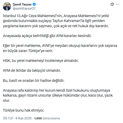 "İstanbul 13.Ağır Ceza Mahkemesi’nin, Anayasa Mahkemesi’ni yetki gasbında bulunmakla suçlayıp Tayfun Kahraman’la ilgili yeniden yargılama kararını yok sayması, çok açık ve net hukuk dışı karardır.