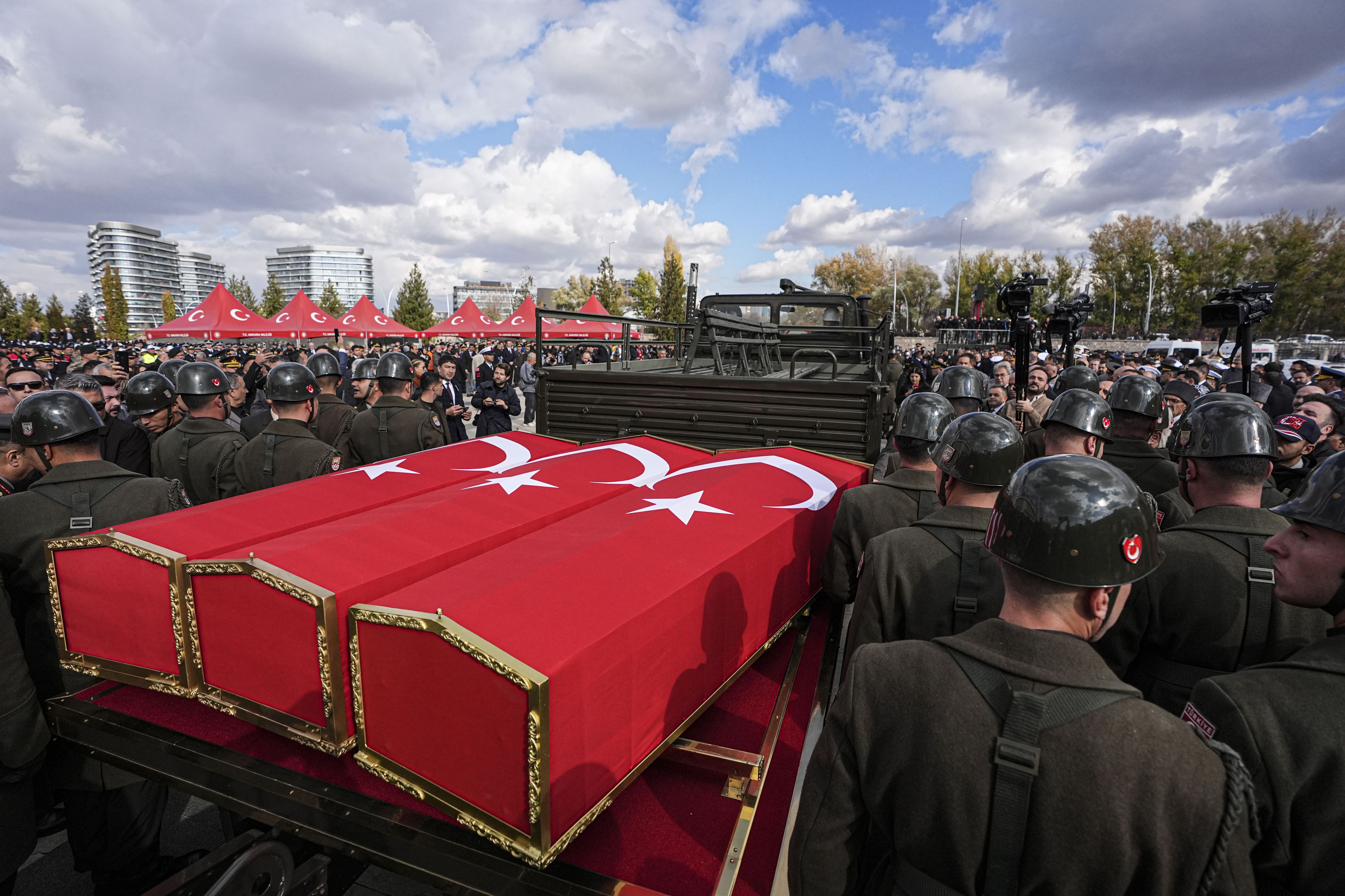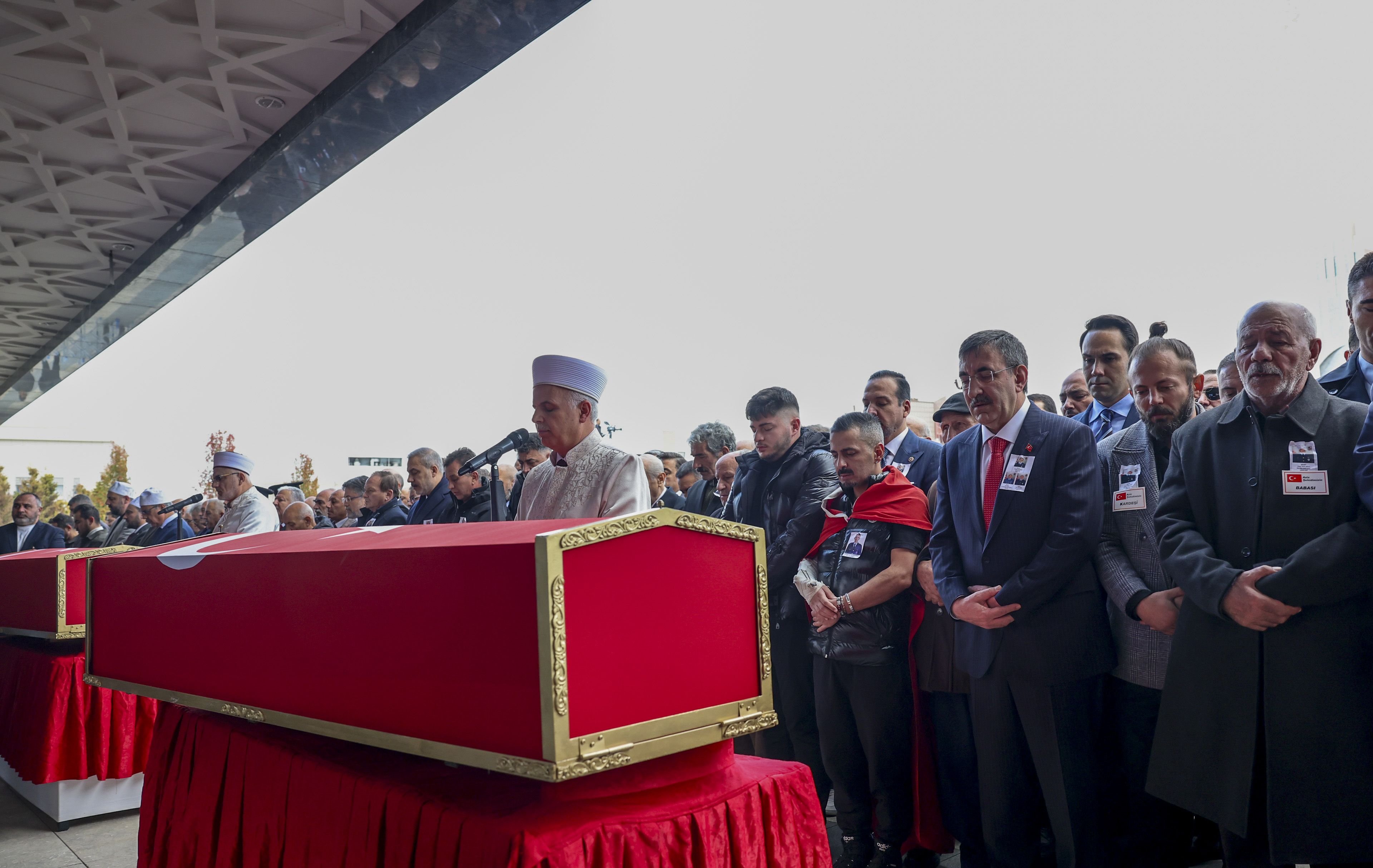 Ahmet Hamdi Akseki Camii’nde düzenlenen cenaze törenine şehit ailelerinin yanı sıra Cumhurbaşkanı Yardımcısı Cevdet Yılmaz, TBMM Başkanı Numan Kurtulmuş, bakanlar Yaşar Güler, Hakan Fidan, Mehmet Şimşek, İbrahim Yumaklı, MHP Genel Başkanı Devlet Bahçeli, İYİ Parti Genel Başkanı Müsavat Dervişoğlu, Genelkurmay Başkanı Selçuk Bayraktaroğlu, kuvvet komutanları ve milletvekilleri katıldı. Protokol üyeleri, şehit ailelerine taziyelerini iletti.