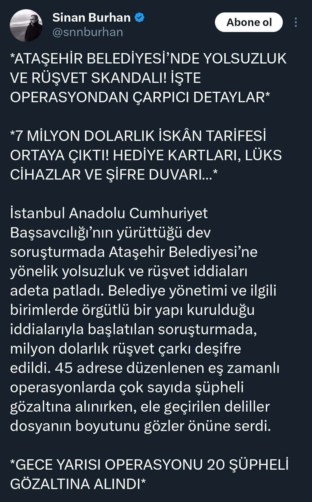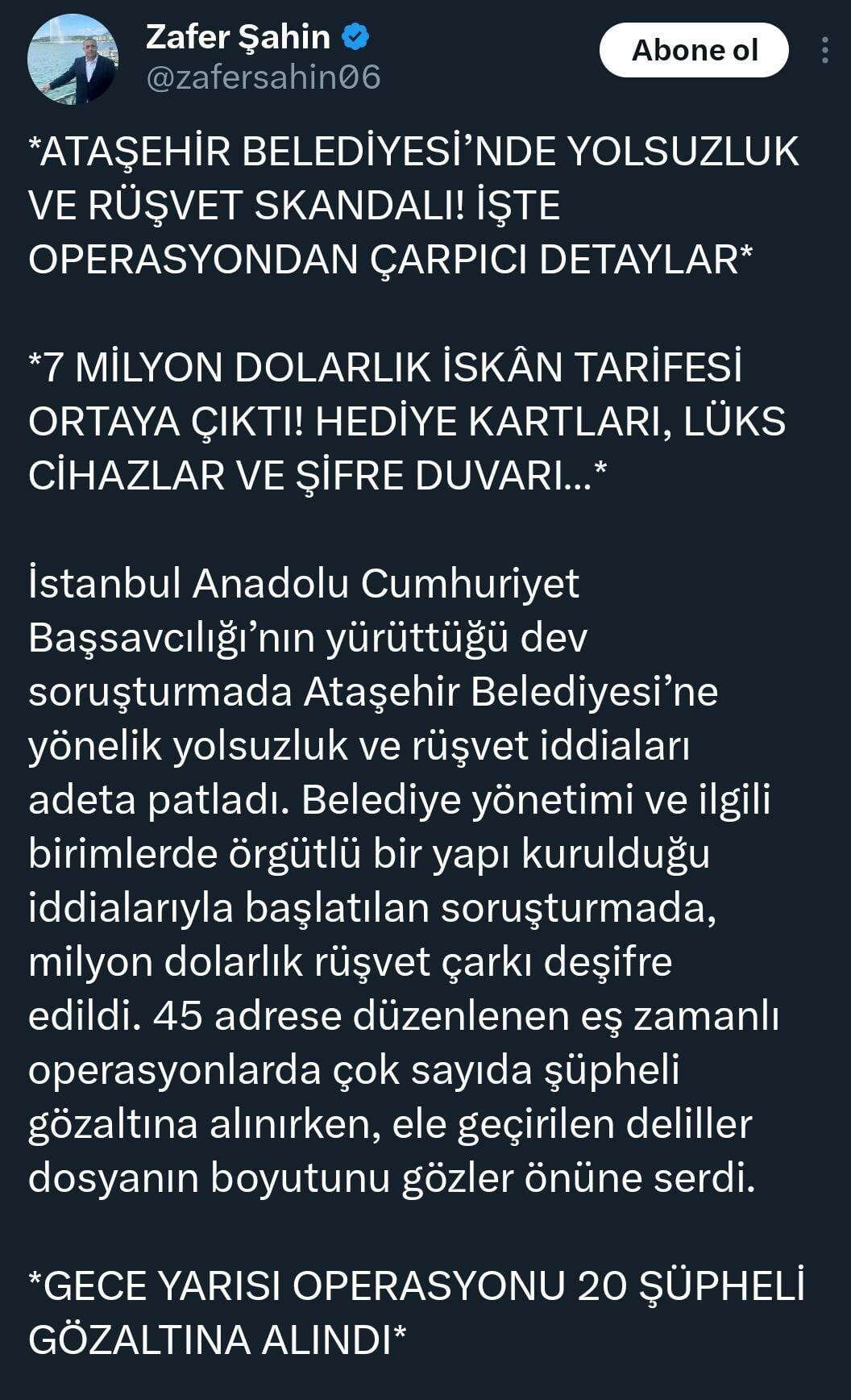 Ataşehir Belediyesi’ne gece saatlerinde düzlenen operasyonda Belediye Başkanı Onursal Adıgüzel ile birlikte 20 kişinin gözaltına alındı. Adıgüzel’in gece 02.00 civarında evinden alınmasına CHP'den peş peşe tepkiler gelirken, iktidara yakın bazı gazetecilerin aynı içerikteki bilgilendirme metinlerini farklı hesaplardan paylaşması dikkat çekti.