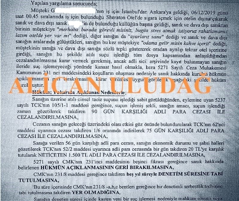 Gazeteci Alican Uludağ'ın haberine göre mahkeme kararına yansıyan bilgilerde, Aziz İhsan Aktaş, Ankara'da bir otelin önünde sigara içen Azerbaycan uyruklu iş kadını G.N.'ye yönelik sözlü tacizde bulundu. Kararda, Aktaş'ın kadına "Bugün stres atmak istiyoruz, rahatlamamız lazım, otelde yer var mı" ve "Odama gelir misin, kahve içeriz" şeklinde ifadeler kullandığı belirtildi. Bu ifadeler neticesinde Aktaş, "cinsel taciz" suçundan 1500 TL adli para cezasına çarptırıldı.