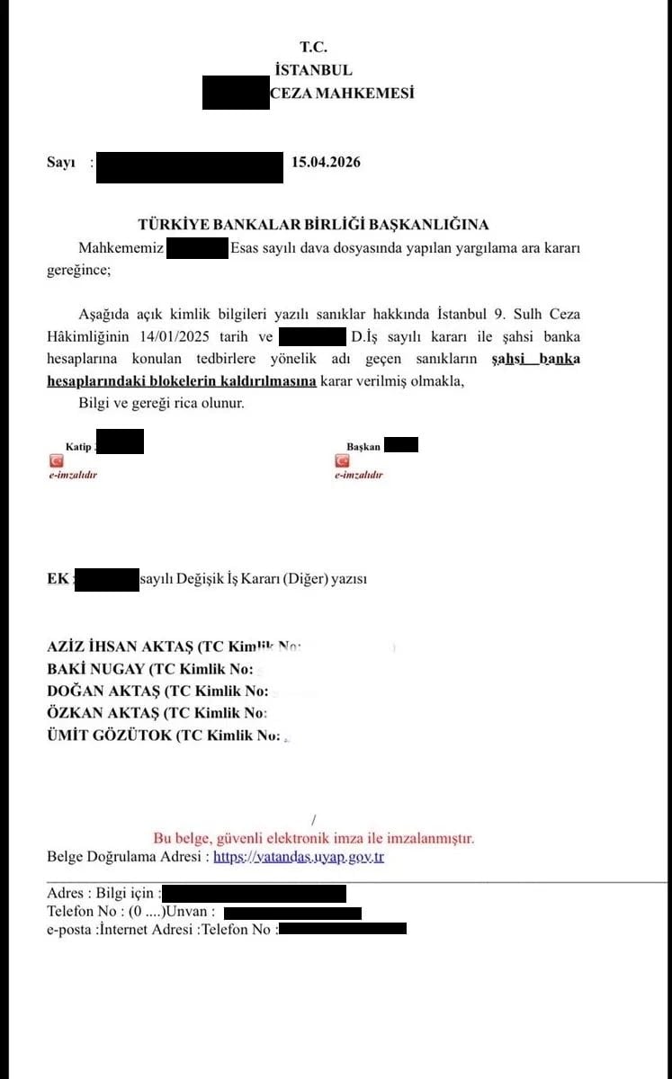 Yarın ikinci duruşması görülecek dava öncesinde ortaya çıkan bilgilere göre, Aktaş’ın yanı sıra Baki Nugay, Doğan-Özkan Aktaş ve Ümit Gözütok’un bireysel hesaplarındaki bloke işlemleri de kaldırıldı.