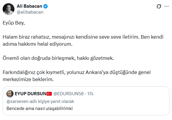 "ÖNEMLİ OLAN DOĞRUDA BİRLEŞMEK, HAKKI GÖZETMEK"DEVA Partisi lideri Ali Babacan ise kendisine ulaşmak isteyen gence sürpriz bir karşılık verdi. Babacan paylaşımında "Eyüp Bey, Halam biraz rahatsız, mesajınızı kendisine seve seve iletirim. Ben kendi adıma hakkımı helal ediyorum. Önemli olan doğruda birleşmek, hakkı gözetmek. Farkındalığınız çok kıymetli, yolunuz Ankara'ya düştüğünde genel merkezimize beklerim" dedi.