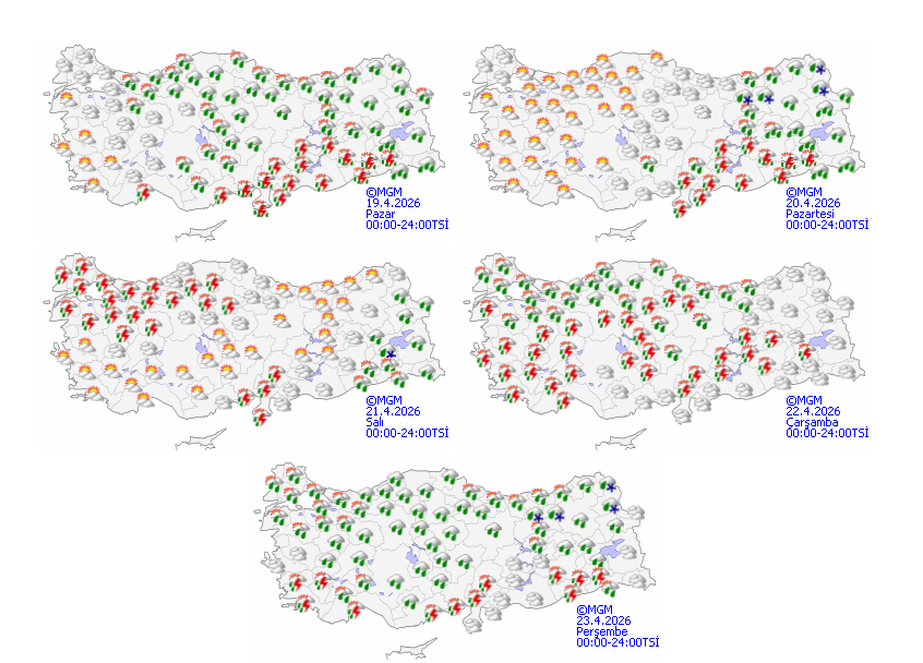 Yağışların, genellikle sağanak ve yer yer gök gürültülü sağanak, Doğu Karadeniz'in iç ve yüksek kesimleri ile Doğu Anadolu'nun kuzeyinde karla karışık yağmur ve kar şeklinde görülmesi beklenen yağışların, Doğu Akdeniz, Güneydoğu Anadolu’nun doğusu ile Bitlis, Şırnak ve Hakkâri çevrelerinde yerel kuvvetli olması bekleniyor.