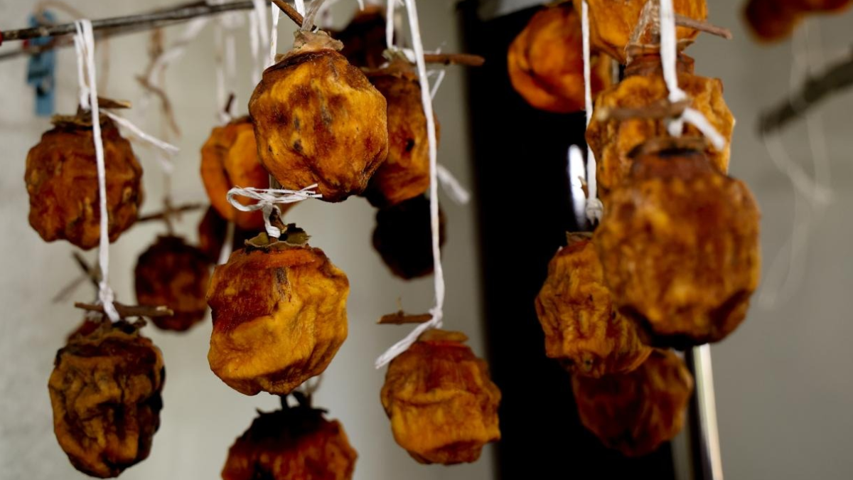 Henüz olgunlaşmadan meyveleri toplayan kadınlar, hurmaları soyarak iplerle odun sobasına asıyorlar.