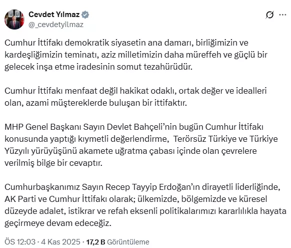 Yılmaz, X hesabından yaptığı açıklamada "Cumhur İttifakı demokratik siyasetin ana damarı, birliğimizin ve kardeşliğimizin teminatı, aziz milletimizin daha müreffeh ve güçlü bir gelecek inşa etme iradesinin somut tezahürüdür. Cumhur İttifakı menfaat değil hakikat odaklı, ortak değer ve idealleri olan, azami müştereklerde buluşan bir ittifaktır.