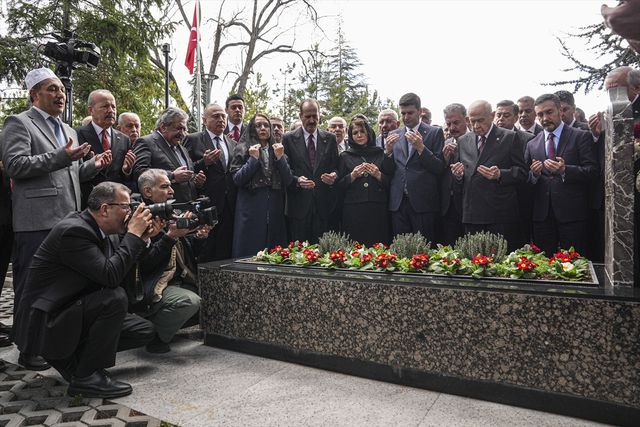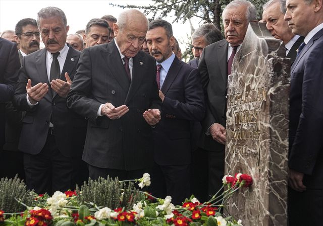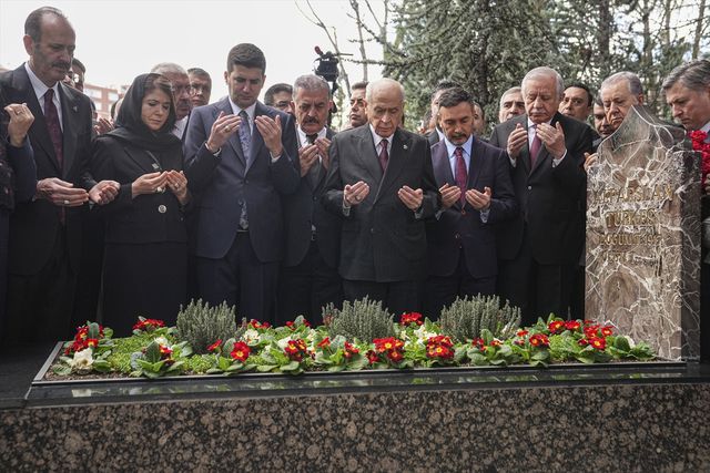 KABRİ BAŞINDA DUA EDİLDİKabir ziyareti sırasında MHP’li heyet, merhum lider için dua etti. Duanın ardından ilk olarak Devlet Bahçeli, ardından da heyet üyeleri Türkeş’in mezarına gül bıraktı. Gül bırakma merasiminin ardından mezara su döküldü.