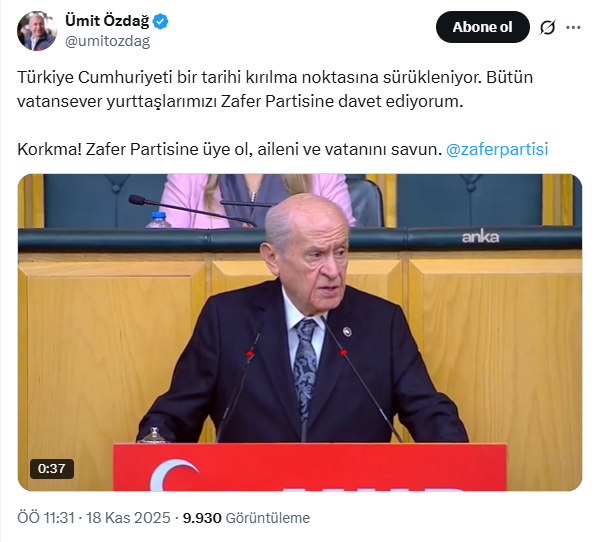 Hemen ardından açıklamanın yer aldığı videoyu paylaşan Zafer Partisi lideri Ümit Özdağ ise, "Türkiye Cumhuriyeti bir tarihi kırılma noktasına sürükleniyor" ifadelerini kullanırken şunları kaydetti: