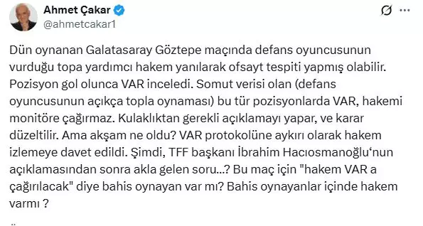 Bu açıklama sonrası eski hakem ve futbol yorumcusu Ahmet Çakar'dan dikkat çeken bir çıkış geldi. Dün Galatasaray ile Göztepe arasında oynana karşılaşmaya atıfta bulunan Çakar, "Dün oynanan Galatasaray Göztepe maçında defans oyuncusunun vurduğu topa yardımcı hakem yanılarak ofsayt tespiti yapmış olabilir. Pozisyon gol olunca VAR inceledi. Somut verisi olan (defans oyuncusunun açıkça topla oynaması) bu tür pozisyonlarda VAR, hakemi monitöre çağırmaz. Kulaklıktan gerekli açıklamayı yapar, ve karar düzeltilir. Ama akşam ne oldu? VAR protokolüne aykırı olarak hakem izlemeye davet edildi. Şimdi, TFF başkanı İbrahim Hacıosmanoğlu'nun açıklamasından sonra akla gelen soru…? Bu maç için 'hakem VAR a çağırılacak' diye bahis oynayan var mı? Bahis oynayanlar içinde hakem var mı?" sorusunu yöneltti.