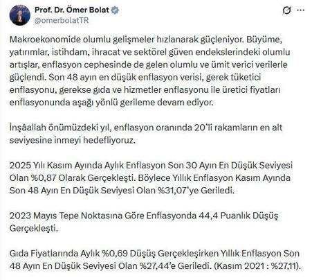 Ticaret Bakanı Ömer Bolat, kasım ayı enflasyon verilerine ilişkin sosyal medya hesabından açıklama yaptı. Bakan Bolat, "Makroekonomide olumlu gelişmeler hızlanarak güçleniyor. Büyüme, yatırımlar, istihdam, ihracat ve sektörel güven endekslerindeki olumlu artışlar, enflasyon cephesinde de gelen olumlu ve ümit verici verilerle güçlendi. Son 48 ayın en düşük enflasyon verisi gerek tüketici enflasyonu gerekse gıda ve hizmetler enflasyonu ile üretici fiyatları enflasyonunda aşağı yönlü gerileme devam ediyor. İnşallah önümüzdeki yıl, enflasyon oranında 20'li rakamların en alt seviyesine inmeyi hedefliyoruz" ifadelerini kullandı.