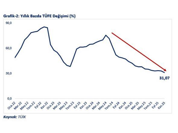 Kasım ayında aylık enflasyonun son 30 ayın en düşük seviyesi olan yüzde 0,87, yıllık enflasyonun son 48 ayın en düşük seviyesi olan yüzde 31,07'ye gerilediğini aktaran Bolat, "2023 Mayıs tepe noktasına göre enflasyonda 44,4 puanlık düşüş gerçekleşti. Gıda fiyatlarında aylık yüzde 0,69 düşüş gerçekleşirken yıllık enflasyon son 48 ayın en düşük seviyesi olan yüzde 27,44'e geriledi. Hizmetler grubunda yıllık enflasyon kasım ayında bir önceki aya göre 0,23 puan azalarak son 43 ayın en düşük seviyesi olan yüzde 44,21 olarak gerçekleşmiştir. Kira fiyatlarında kasım ayında aylık enflasyon son 33 ayın en düşük seviyesi olan yüzde 2,49 oranında gerçekleşirken, yıllık enflasyon son 32 ayın en düşük seviyesi olan yüzde 63,59 olarak gerçekleşmiştir. Enerji, gıda ve içecekler, tütün ve altın ürünleri hariç TÜFE aylık enflasyonu, kasım ayında yüzde 1,22 oranında gerçekleşirken yıllık çekirdek enflasyon ise kasım ayında son 48 ayın en düşük seviyesi olan yüzde 31,65'e inmiştir" açıklamasında bulundu.
