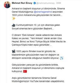 Bakan Ersoy, Ankara'nın başkent oluşunun yıl dönümü nedeniyle NSosyal hesabında, Cumhuriyetin 10'uncu yılı için 1933'te Türkiye'ye gelen Sovyet sinemacıların uçaktan çektiği görüntüleri paylaştı. Ersoy, videoda, o dönem 'Eski Ankara' olarak adlandırılan Ankara Kalesi ve çevresi, 'Yeni Ankara' olarak anılan Ulus Heykel, Birinci ve İkinci Türkiye Büyük Millet Meclisi ile Çankaya Köşkü'nden eşsiz görüntüler yer aldığını belirterek, "1933 yapımı filmden kısa bir görüntü ile başkentimizin gökyüzünden nasıl bir değişim ve dönüşüm sürecinde olduğunun kesitini izliyoruz. Gökyüzünden yansıyan bu görüntülerle birlikte, Ankara'nın başkent oluşunun yıl dönümünü coşkuyla kutluyoruz. Arşiv görüntülerinin tamamına Sinema Genel Müdürlüğümüzün YouTube kanalından ulaşabilirsiniz" dedi.