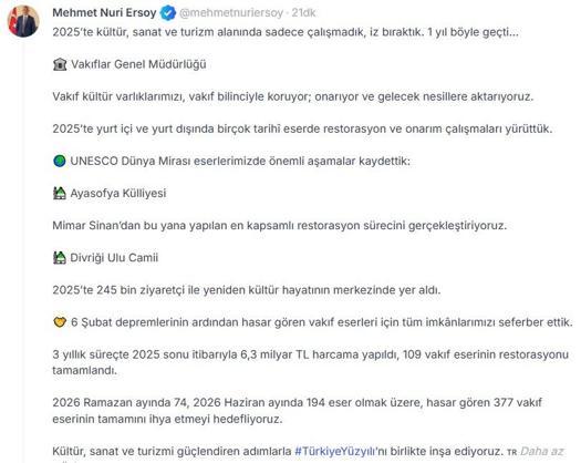 Bakan Ersoy, sanal medya hesabından yaptığı açıklamada, vakıf kültür varlıklarını, vakıf bilinciyle koruyor, onarıyor ve gelecek nesillere aktardıklarını belirtti. Ersoy, 2025’te yurt içi ve yurt dışında birçok tarihi eserde restorasyon ve onarım çalışması yürüttüklerini, UNESCO Dünya Mirası eserlerinde önemli aşamalar kaydettiklerini belirtti.