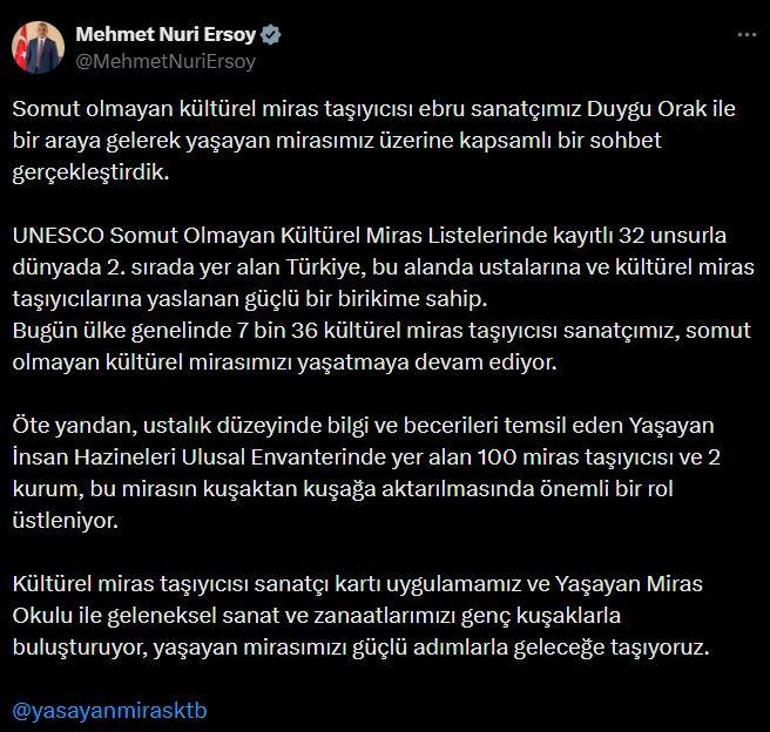 Kültür ve Turizm Bakanı Mehmet Nuri Ersoy, sanal medya hesabından yaptığı paylaşımda, "Somut olmayan kültürel miras taşıyıcısı ebru sanatçımız Duygu Orak ile bir araya gelerek yaşayan mirasımız üzerine kapsamlı bir sohbet gerçekleştirdik. UNESCO Somut Olmayan Kültürel Miras Listelerinde kayıtlı 32 unsurla dünyada 2'nci sırada yer alan Türkiye, bu alanda ustalarına ve kültürel miras taşıyıcılarına yaslanan güçlü bir birikime sahip. Bugün ülke genelinde 7 bin 36 kültürel miras taşıyıcısı sanatçımız, somut olmayan kültürel mirasımızı yaşatmaya devam ediyor. Öte yandan, ustalık düzeyinde bilgi ve becerileri temsil eden Yaşayan İnsan Hazineleri Ulusal Envanterinde yer alan 100 miras taşıyıcısı ve 2 kurum, bu mirasın kuşaktan kuşağa aktarılmasında önemli bir rol üstleniyor. Kültürel miras taşıyıcısı sanatçı kartı uygulamamız ve Yaşayan Miras Okulu ile geleneksel sanat ve zanaatlarımızı genç kuşaklarla buluşturuyor, yaşayan mirasımızı güçlü adımlarla geleceğe taşıyoruz" dedi.