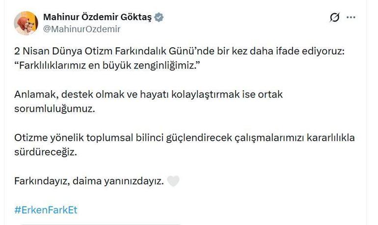 Bakan Göktaş, '2 Nisan Dünya Otizm Farkındalık Günü' nedeniyle sanal medya hesabından videolu paylaşımda bulundu. Göktaş, paylaşımda, "Farklılıklarımız en büyük zenginliğimiz. Anlamak, destek olmak ve hayatı kolaylaştırmak ise ortak sorumluluğumuz. Otizme yönelik toplumsal bilinci güçlendirecek çalışmalarımızı kararlılıkla sürdüreceğiz. Farkındayız, daima yanınızdayız" ifadelerini kullandı.