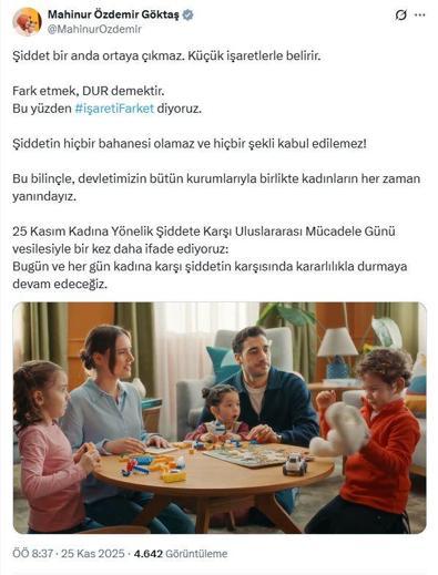 Aile ve Sosyal Hizmetler Bakanı Mahinur Özdemir, '25 Kasım Kadına Yönelik Şiddete Karşı Uluslararası Mücadele Günü' kapsamında sosyal medya hesabından paylaşım yaptı. Bakan Göktaş, "Şiddet bir anda ortaya çıkmaz. Küçük işaretlerle belirir. Fark etmek, 'Dur' demektir. Bu yüzden 'İşareti farket' diyoruz. Şiddetin hiçbir bahanesi olamaz ve hiçbir şekli kabul edilemez. Bu bilinçle, devletimizin bütün kurumlarıyla birlikte kadınların her zaman yanındayız. 25 Kasım Kadına Yönelik Şiddete Karşı Uluslararası Mücadele Günü vesilesiyle bir kez daha ifade ediyoruz. Bugün ve her gün kadına karşı şiddetin karşısında kararlılıkla durmaya devam edeceğiz" dedi.