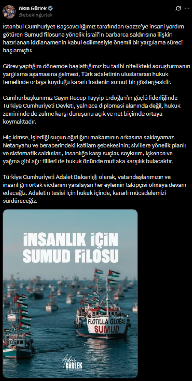 Adalet Bakanı Akın Gürlek, sosyal medya hesabından yaptığı paylaşımda, İstanbul Cumhuriyet Başsavcılığı tarafından, Gazze'ye insani yardım götüren Sumud Filosu'na yönelik İsrail'in barbarca saldırısına ilişkin hazırlanan iddianamenin kabul edilmesiyle önemli bir yargılama sürecinin başladığını belirtti.