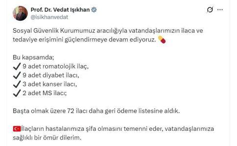 Bakan Işıkhan, sosyal medya hesabından yaptığı açıklamada, "Sosyal Güvenlik Kurumumuz aracılığıyla vatandaşlarımızın ilaca ve tedaviye erişimini güçlendirmeye devam ediyoruz. Bu kapsamda; 9 adet romatolojik ilaç, 9 adet diyabet ilacı, 3 adet kanser ilacı, 2 adet MS ilacı başta olmak üzere 72 ilacı daha geri ödeme listesine aldık. İlaçların hastalarımıza şifa olmasını temenni eder, vatandaşlarımıza sağlıklı bir ömür dilerim" ifadelerini kullandı.