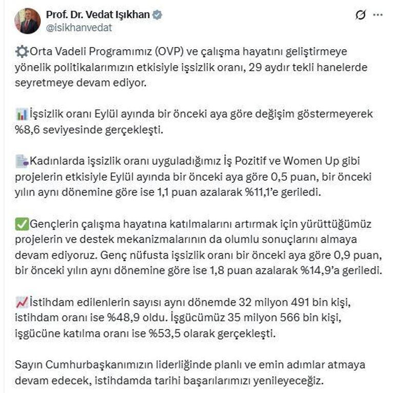 Çalışma ve Sosyal Güvenlik Bakanı Vedat Işıkhan, eylül ayı iş gücü istatistiklerine ilişkin sosyal medya hesabından açıklama yaptı. Bakan Işıkhan, "Orta Vadeli Programımız (OVP) ve çalışma hayatını geliştirmeye yönelik politikalarımızın etkisiyle işsizlik oranı, 29 aydır tekli hanelerde seyretmeye devam ediyor. İşsizlik oranı eylül ayında bir önceki aya göre değişim göstermeyerek yüzde 8,6 seviyesinde gerçekleşti. Kadınlarda işsizlik oranı uyguladığımız İş Pozitif ve Women Up gibi projelerin etkisiyle eylül ayında bir önceki aya göre 0,5 puan, bir önceki yılın aynı dönemine göre ise 1,1 puan azalarak yüzde 11,1'e geriledi. Gençlerin çalışma hayatına katılmalarını artırmak için yürüttüğümüz projelerin ve destek mekanizmalarının da olumlu sonuçlarını almaya devam ediyoruz. Genç nüfusta işsizlik oranı bir önceki aya göre 0,9 puan, bir önceki yılın aynı dönemine göre ise 1,8 puan azalarak yüzde 14,9'a geriledi. İstihdam edilenlerin sayısı aynı dönemde 32 milyon 491 bin kişi, istihdam oranı ise yüzde 48,9 oldu. İş gücümüz 35 milyon 566 bin kişi, iş gücüne katılma oranı ise yüzde 53,5 olarak gerçekleşti. Sayın Cumhurbaşkanımızın liderliğinde planlı ve emin adımlar atmaya devam edecek, istihdamda tarihi başarılarımızı yenileyeceğiz" ifadelerini kullandı.