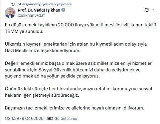 Bakan Işıkhan, sanal medya hesabından yaptığı açıklamada, "En düşük emekli aylığının 20 bin TL'ye yükseltilmesi ile ilgili kanun teklifi TBMM'ye sunuldu. Ülkemizin kıymetli emektarları için atılan bu kıymetli adım dolayısıyla Gazi Meclisimize teşekkür ediyorum. Değerli emeklilerimiz başta olmak üzere aziz milletimize en iyi hizmetleri sunabilmek için Sosyal Güvenlik bütçemizi daha da geliştirmek ve güçlendirmek adına yoğun şekilde çalışıyoruz. Önümüzdeki süreçte her bir vatandaşımızın refahını korumayı ve sosyal haklarını genişletmeyi sürdüreceğiz. Başımızın tacı emeklilerimize ve ailelerine hayırlı olmasını diliyorum" dedi.