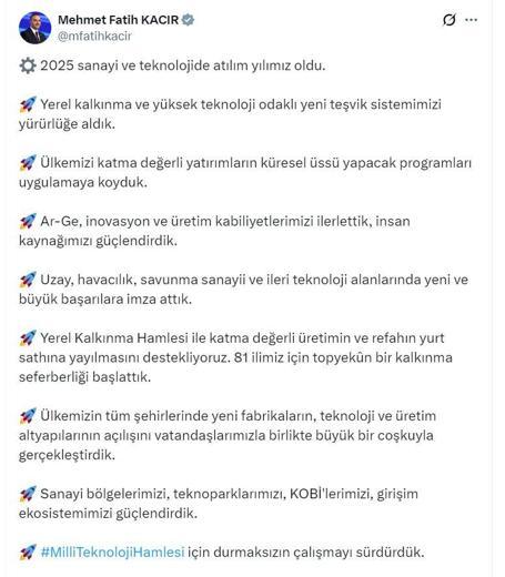 Bakan Kacır, yeni yıl nedeniyle sanal medya hesabından bir mesaj yayımladı. Kacır, "2025 sanayi ve teknolojide atılım yılımız oldu. Yerel kalkınma ve yüksek teknoloji odaklı yeni teşvik sistemimizi yürürlüğe aldık. Ülkemizi katma değerli yatırımların küresel üssü yapacak programları uygulamaya koyduk. Ar-Ge, inovasyon ve üretim kabiliyetlerimizi ilerlettik, insan kaynağımızı güçlendirdik. Uzay, havacılık, savunma sanayi ve ileri teknoloji alanlarında yeni ve büyük başarılara imza attık. Yerel Kalkınma Hamlesi ile katma değerli üretimin ve refahın yurt sathına yayılmasını destekliyoruz. 81 ilimiz için topyekun bir kalkınma seferberliği başlattık. Ülkemizin tüm şehirlerinde yeni fabrikaların, teknoloji ve üretim altyapılarının açılışını vatandaşlarımızla birlikte büyük bir coşkuyla gerçekleştirdik. Sanayi bölgelerimizi, teknoparklarımızı, KOBİ'lerimizi, girişim ekosistemimizi güçlendirdik. Milli Teknoloji Hamlesi için durmaksızın çalışmayı sürdürdük. Cumhurbaşkanımız Sayın Recep Tayyip Erdoğan’ın liderliğinde, kritik teknolojilerde 'Tam Bağımsız Türkiye' hedefiyle durmadan, duraksamadan koşmaya devam edeceğiz" ifadelerini kullandı.