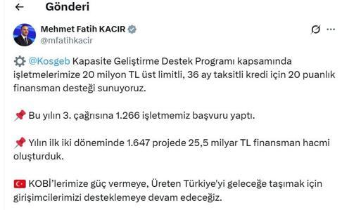 Bakan Kacır, sosyal medya hesabından yaptığı paylaşımda, "KOSGEB Kapasite Geliştirme Destek Programı kapsamında işletmelerimize 20 milyon TL üst limitli, 36 ay taksitli kredi için 20 puanlık finansman desteği sunuyoruz. Bu yılın 3'üncü çağrısına 1266 işletmemiz başvuru yaptı.