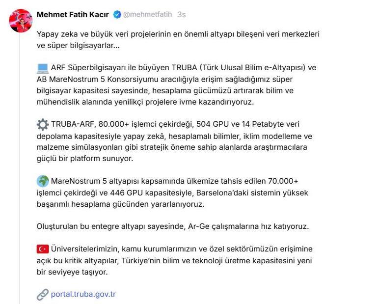 Bakan Kacır, NSosyal hesabından yaptığı açıklamada, "Yapay zeka ve büyük veri projelerinin en önemli altyapı bileşeni veri merkezleri ve süper bilgisayarlar. ARF süper bilgisayarı ile büyüyen TRUBA (Türk Ulusal Bilim e-Altyapısı) ve AB MareNostrum 5 Konsorsiyumu aracılığıyla erişim sağladığımız süper bilgisayar kapasitesi sayesinde, hesaplama gücümüzü artırarak bilim ve mühendislik alanında yenilikçi projelere ivme kazandırıyoruz.