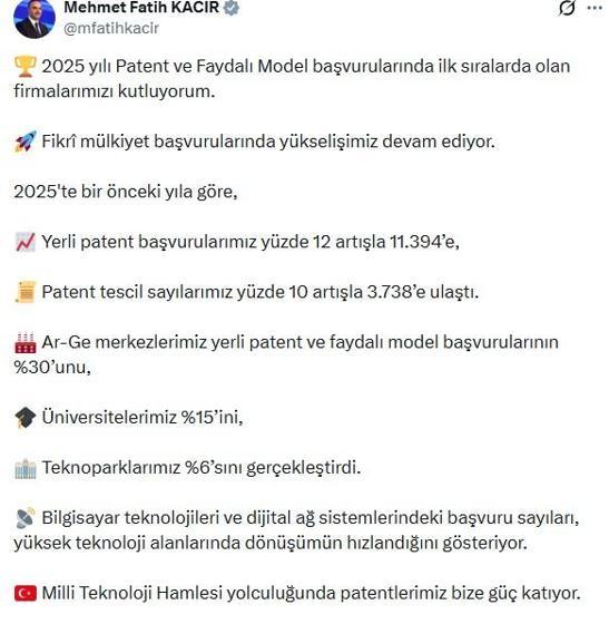 Bakan Kacır, sanal medya hesabından yaptığı açıklamada, "2025 yılı patent ve faydalı model başvurularında ilk sıralarda olan firmalarımızı kutluyorum. Fikri mülkiyet başvurularında yükselişimiz devam ediyor. 2025'te bir önceki yıla göre, yerli patent başvurularımız yüzde 12 artışla 11 bin 394’e, patent tescil sayılarımız yüzde 10 artışla 3 bin 738’e ulaştı. Ar-Ge merkezlerimiz yerli patent ve faydalı model başvurularının yüzde 30’unu, üniversitelerimiz yüzde 15’ini, teknoparklarımız yüzde 6’sını gerçekleştirdi. Bilgisayar teknolojileri ve dijital ağ sistemlerindeki başvuru sayıları, yüksek teknoloji alanlarında dönüşümün hızlandığını gösteriyor. Milli Teknoloji Hamlesi yolculuğunda patentlerimiz bize güç katıyor" ifadelerini kullandı.