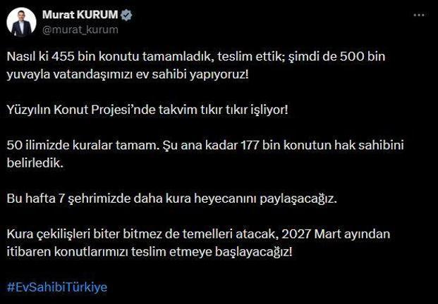 Bakan Kurum, sanal medya hesabından, Türkiye genelinde 500 bin sosyal konutun inşa edileceği Yüzyılın Konut Projesi’nde 9-15 Şubat kura programını paylaştı. Kurum, deprem bölgesinde tamamlanan konutlara dikkat çekerek, “Nasıl ki 455 bin konutu tamamladık, teslim ettik; şimdi de 500 bin yuvayla vatandaşımızı ev sahibi yapıyoruz. Yüzyılın Konut Projesi’nde takvim tıkır tıkır işliyor. 50 ilimizde kuralar tamam. Şu ana kadar 177 bin konutun hak sahibini belirledik. Bu hafta 7 şehrimizde daha kura heyecanını paylaşacağız. Kura çekilişleri biter bitmez de temelleri atacak, 2027 Mart ayından itibaren konutlarımızı teslim etmeye başlayacağız” dedi.