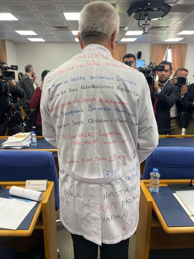 TBMM Plan ve Bütçe Komisyonu, Sağlık Bakanlığı'nın 2026 Yılı Merkezi Yönetim Bütçe Kanunu Teklifi ile 2024 Yılı Merkezi Yönetim Kesin Hesap Kanun Teklifi'ni görüşmek üzere AK Parti Samsun Milletvekili Mehmet Muş başkanlığında toplandı. CHP Uşak Milletvekili Ali Karaoba, sağlık sorunların yazılı olduğu doktor önlüğü ile toplantıya katıldı. Karaoba, "Bakın 2002 yılından bu yana, 'Sağlıkta dönüşüm, değişim' dediler ama aslında çöküşü yarattılar. Bugün çeteleşen, parasallaşan bir sistem haline getirdiler. Bakın tabip odası da söylüyor, bizler de söylüyoruz; bir kişi dahi eksilmek istemiyoruz. Öldürülen hekimler bunlar. Yıllarca uğraşıp, didinmiş, ailesinin çabası ile okumuş çocuklar öldürülüyor bu ülkede. Kollarıma atanamayan ebe, hemşire her meslek grubundan var. Madem atamayacaksınız kardeşim, niye okullar açıyorsunuz" dedi. CHP Malatya Milletvekili Veli Ağbaba ise İstanbul Fatih'te hayatını kaybeden Böcek ailesini hatırlattı.