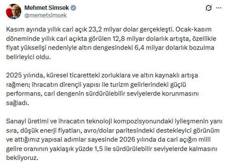 Hazine ve Maliye Bakanı Mehmet Şimşek, kasım ayı ödemeler dengesi istatistiklerine ilişkin sanal medya hesabından açıklama yaptı. Bakan Şimşek, "Kasım ayında yıllık cari açık 23,2 milyar dolar gerçekleşti. Ocak-kasım döneminde yıllık cari açıkta görülen 12,8 milyar dolarlık artışta, özellikle fiyat yükselişi nedeniyle altın dengesindeki 6,4 milyar dolarlık bozulma belirleyici oldu. 2025 yılında, küresel ticaretteki zorluklara ve altın kaynaklı artışa rağmen; ihracatın dirençli yapısı ile turizm gelirlerindeki güçlü performans, cari dengenin sürdürülebilir seviyelerde korunmasını sağladı. Sanayi üretimi ve ihracatın teknoloji kompozisyonundaki iyileşmenin yanı sıra, düşük enerji fiyatları, avro/dolar paritesindeki destekleyici görünüm ve attığımız yapısal adımlar sayesinde 2026 yılında da cari açığın milli gelire oranının yaklaşık yüzde 1,5 ile sürdürülebilir seviyelerde kalmasını bekliyoruz" ifadelerini kullandı.