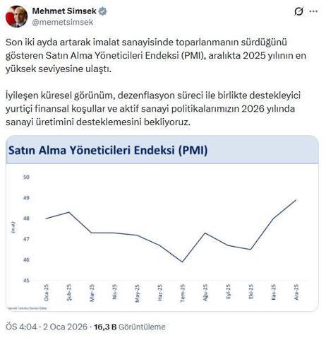 Bakan Mehmet Şimşek, sanal medya hesabından yaptığı açıklamada, "Son iki ayda artarak imalat sanayisinde toparlanmanın sürdüğünü gösteren satın alma yöneticileri endeksi, aralıkta 2025 yılının en yüksek seviyesine ulaştı. İyileşen küresel görünüm, dezenflasyon süreci ile birlikte destekleyici yurt içi finansal koşullar ve aktif sanayi politikalarımızın 2026 yılında sanayi üretimini desteklemesini bekliyoruz" ifadelerini kullandı.