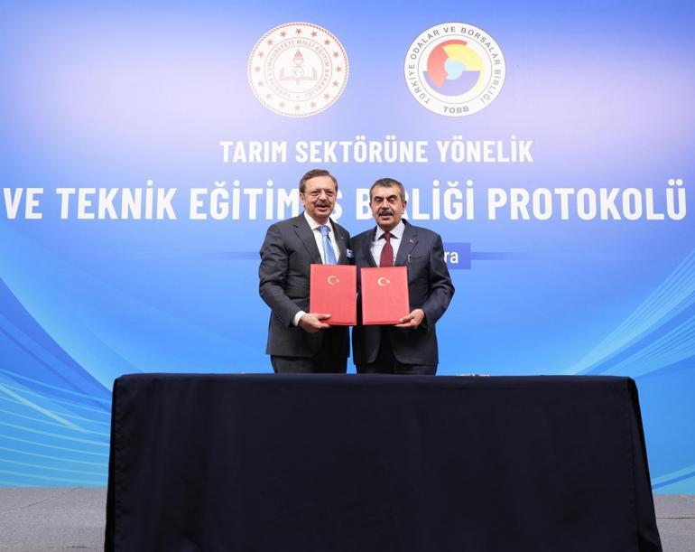 TOBB Başkanı Rifat Hisarcıklıoğlu ise tarım sektöründe, modern tarım tekniklerini bilen, gıda teknolojileri ve laboratuvar uygulamalarına hakim, hayvancılıkta bakım ve sağlığı profesyonelce yürütebilen tekniker ve teknisyenlere büyük ihtiyaç olduğunu vurgulayarak, "Bir tarafta üretimin teknolojik dönüşümü hızlanırken, diğer tarafta sahada uygulayacak, bakımını yapacak ve yenilikleri uygulamaya koyacak ara eleman açığı devam etmektedir. Bu boşluk, verimlilik, kalite ve rekabet gücümüzü doğrudan etkiliyor, gençlerimiz için sürdürülebilir istihdam fırsatlarının önünde bir bariyer oluşturuyor. İşte tam da bu nedenlerle bu protokolün önemi büyüktür. Milli Eğitim Bakanlığımız ile TOBB arasında bugün imzalanacak olan bu iş birliğiyle, çeşitli illerde tarım alanındaki 30 meslek lisesini Ticaret Borsalarımız ile Ticaret ve Sanayi Odalarımızla eşleştireceğiz. Tarım meslek liselerimiz, öğrencilere hem teorik bilgiyi hem de gerçek üretim ortamlarında uygulamalı deneyimi verecek. Dolayısıyla mezun olduklarında doğrudan üretim süreçlerine katılabilecek, işletmelerin aradığı nitelikte elemanlar haline gelecekler" dedi.