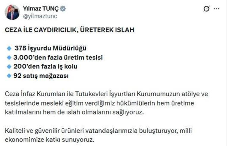 Bakan Tunç, sanal medya hesabından 'Ceza İle Caydırıcılık, Üreterek Islah' başlığı ile yaptığı paylaşımda, "378 işyurdu müdürlüğü, 3 binden fazla üretim tesisi, 200’den fazla iş kolu, 92 satış mağazası; Ceza İnfaz Kurumları ile Tutukevleri İşyurtları Kurumumuzun atölye ve tesislerinde mesleki eğitim verdiğimiz hükümlülerin hem üretime katılmalarını hem de ıslah olmalarını sağlıyoruz. Kaliteli ve güvenilir ürünleri vatandaşlarımızla buluşturuyor, milli ekonomimize katkı sunuyoruz" ifadelerini kullandı.