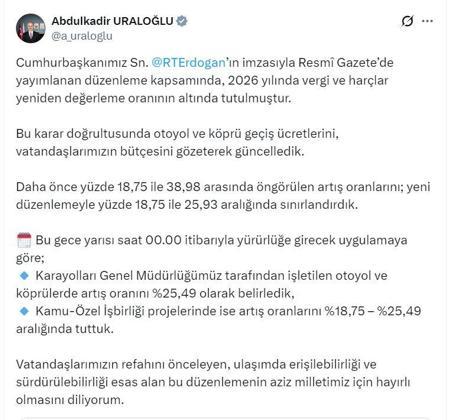 Uraloğlu, "Bu gece yarısı saat 00.00 itibarıyla yürürlüğe girecek uygulamaya göre; Karayolları Genel Müdürlüğümüz tarafından işletilen otoyol ve köprülerde artış oranını yüzde 25,49 olarak belirledik, kamu-özel iş birliği projelerinde ise artış oranlarını yüzde 18,75- yüzde 25,49 aralığında tuttuk. Vatandaşlarımızın refahını önceleyen, ulaşımda erişilebilirliği ve sürdürülebilirliği esas alan bu düzenlemenin aziz milletimiz için hayırlı olmasını diliyorum" ifadelerini kullandı.