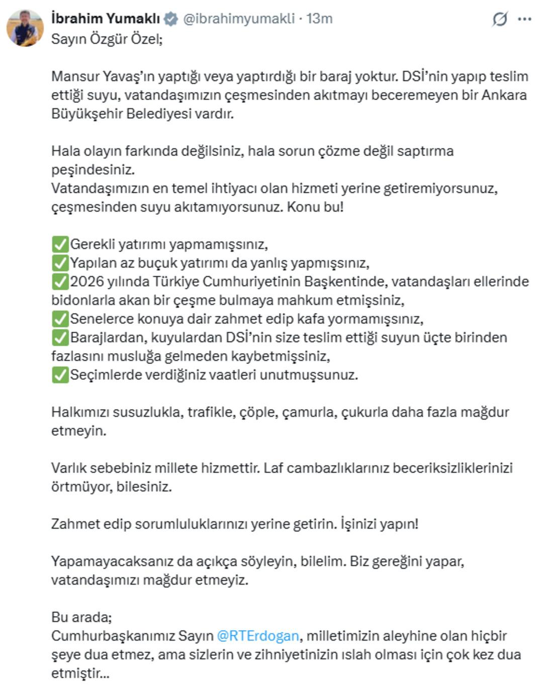 Bakan Yumaklı dan CHP lideri Özel e Ankara yanıtı