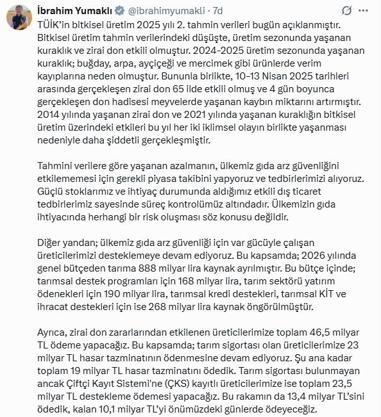 Yumaklı, diğer yandan ülkenin gıda arz güvenliği için var gücüyle çalışan üreticileri desteklemeye devam ettiklerini vurgulayarak, "Bu kapsamda; 2026 yılında genel bütçeden tarıma 888 milyar lira kaynak ayrılmıştır. Bu bütçe içinde; tarımsal destek programları için 168 milyar lira, tarım sektörü yatırım ödenekleri için 190 milyar lira, tarımsal kredi destekleri, tarımsal KİT ve ihracat destekleri için ise 268 milyar lira kaynak öngörülmüştür. Ayrıca, zirai don zararlarından etkilenen üreticilerimize toplam 46,5 milyar TL ödeme yapacağız. Bu kapsamda; tarım sigortası olan üreticilerimize 23 milyar TL hasar tazminatının ödenmesine devam ediyoruz. Şu ana kadar toplam 19 milyar TL hasar tazminatını ödedik. Tarım sigortası bulunmayan ancak Çiftçi Kayıt Sistemi'ne (ÇKS) kayıtlı üreticilerimize ise toplam 23,5 milyar TL destekleme ödemesi yapacağız. Bu rakamın da 13,4 milyar TL’sini ödedik, kalan 10,1 milyar TL’yi önümüzdeki günlerde ödeyeceğiz. Bugün açıklanan veriler üzerinden, ülkemiz gıda ihtiyacının karşılanmasına dönük maksatlı yorum ve haberlere vatandaşlarımızın itibar etmemesini rica ederiz. Tarımsal üretimimiz ve gıda arz güvenliğine dönük aldığımız tedbirlerle, vatandaşlarımızın gıda ihtiyacı sorunsuz şekilde karşılanmaya devam edecektir" ifadelerine yer verdi.