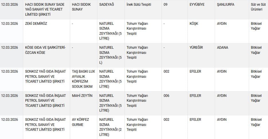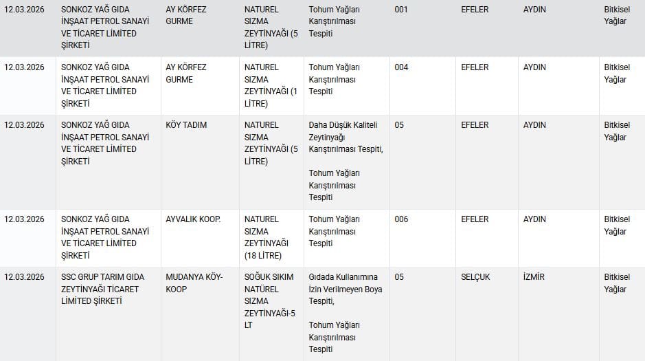 Sonkoz Yağ Gıda (Köy Tadim): 5 litrelik "Naturel Sızma Zeytinyağı" ürününde "Daha Düşük Kaliteli Zeytinyağı Karıştırılması" ve "Tohum Yağları Karıştırılması" raporlandı.