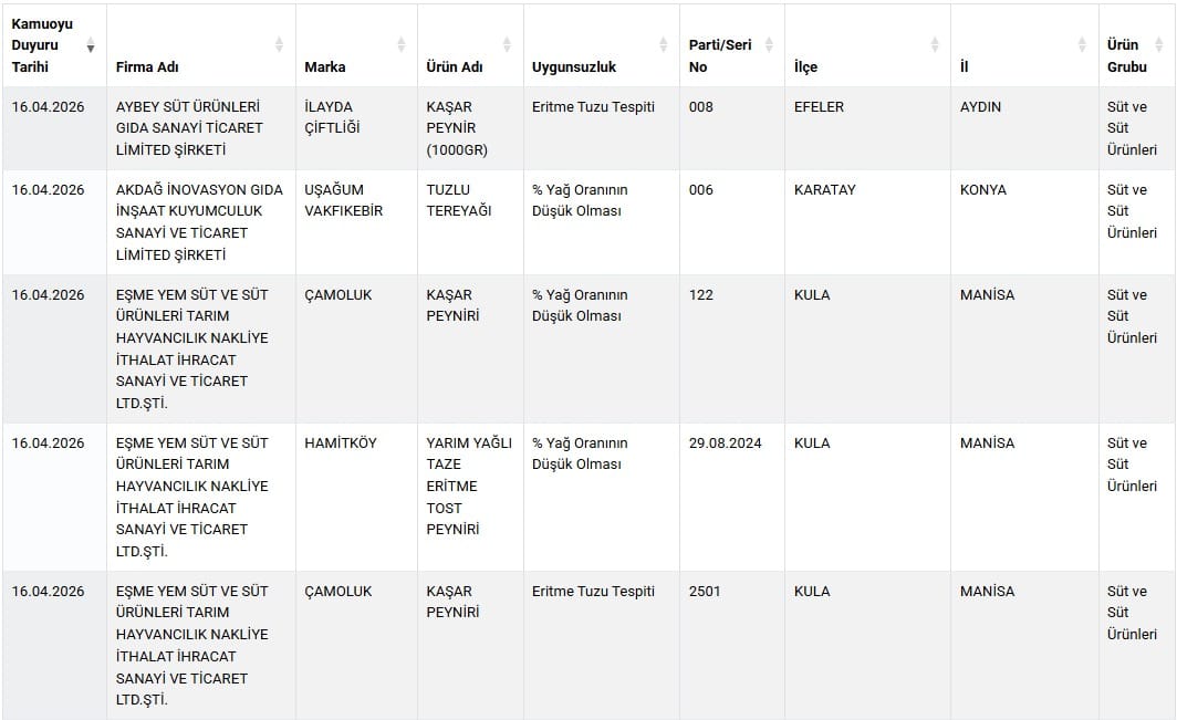 Çamoluk markalı kaşar peynirlerinde hem düşük yağ oranı hem de yasaklı eritme tuzu kullanımı rapor edildi.