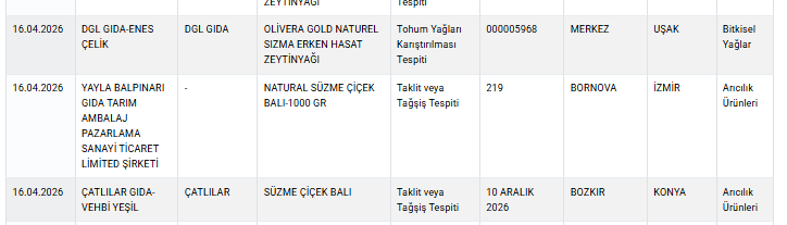 ZEYTİNYAĞI VE ARICILIK ÜRÜNLERİNDE TAĞŞİŞBitkisel yağlar kategorisinde yapılan analizlerde, özellikle zeytinyağı ürünlerinde standart dışı uygulamalar görüldü. "Natürel Sızma Zeytinyağı" etiketiyle piyasaya arz edilen bazı ürünlerin içeriğine, daha düşük kaliteli zeytinyağlarının yanı sıra farklı tohum yağlarının karıştırıldığı teyit edildi. Benzer şekilde, süzme çiçek ballarında da doğal içeriği yansıtmayan taklit ve tağşiş uygulamalarının yapıldığı bildirildi.